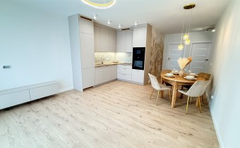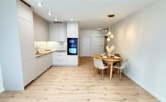 Kuchnia w pełni wyposażona w nowoczesny sprzęt AGD: lodówkę, piekarnik, mikrofalówkę oraz zmywarkę.