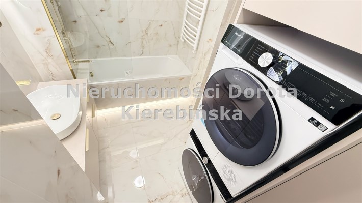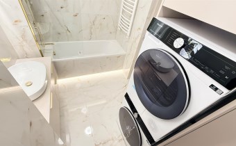 Łazienka wyposażona w pralkę oraz suszarkę.